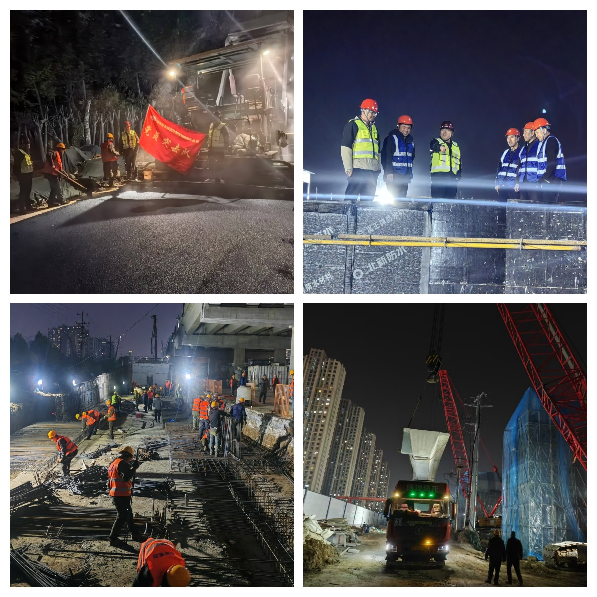 晚上11點(diǎn),項(xiàng)目現(xiàn)場(chǎng)干勁十足、熱火朝天,市政集團(tuán)領(lǐng)導(dǎo)班子現(xiàn)場(chǎng)指揮調(diào)度,黨員突擊隊(duì)帶領(lǐng)職工加班加點(diǎn)完成路面攤鋪?zhàn)鳂I(yè);凌晨1點(diǎn),施工現(xiàn)場(chǎng)機(jī)械轟鳴、人頭攢動(dòng),黨員突擊隊(duì)帶領(lǐng)項(xiàng)目干部職工激戰(zhàn)正酣,運(yùn)渣土、扎鋼筋、支模版、吊橋體,所有工序緊張高效調(diào)度,最大限度提高施工進(jìn)度。