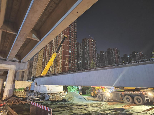 槐安路高架西延?xùn)|側(cè)匝道首片預(yù)制箱梁順利架設(shè)